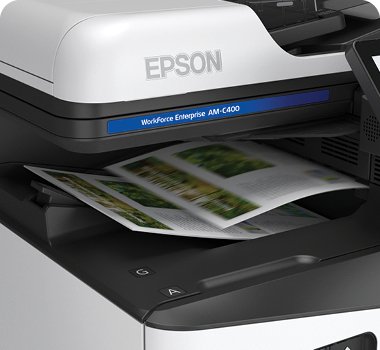 The WorkForce® Enterprise AM-C400 A4 Color MFP delivers powerful business productivity with print speeds up to 40 ISO ppm†, high-performance scanning, a fast first page out and Legal-sized media support. Powered by revolutionary PrecisionCore Heat-Free technology, it’s engineered for exceptional reliability and provides outstanding image quality, along with the lowest power consumption in its class1—up to 55% lower vs. color laser printers1. Remarkably flexible to fit virtually any workspace, the AM-C400 can be configured as either a desktop or floor-standing unit with the option to add up to three cassettes for a total of five paper sources. And it offers a user experience consistent with our WorkForce Enterprise AM Series A3 models, including a large, intuitive 10.1″ customizable color touchscreen for easy navigation and support for the Epson® Solutions Suite.